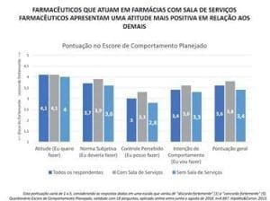 Os entrevistados responderam 18 perguntas opinativas que avaliam a atitude, motivação e intenção de comportamento em relação aos serviços farmacêuticos. As respostas variavam de “discordo fortemente” a “concordo fortemente”, podendo gerar um escore máximo de 100 pontos. Quanto mais alta a pontuação no teste, melhor o perfil do profissional para os serviços farmacêuticos.