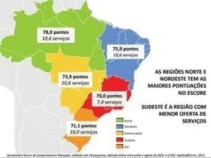 No comparativo entre as regiões do País, profissionais do Norte e Nordeste apresentaram os melhores perfis para os serviços farmacêuticos: média de 78 e 75,9 pontos, respectivamente. Como consequência, cada profissional dessas regiões oferece até 10 tipos de serviços ao longo de oito a nove horas semanais com atendimento privativo. A região Sudeste cravou 70 pontos, com média de sete tipos de serviços por farmacêutico e seis horas de dedicação semanal aos atendimentos.